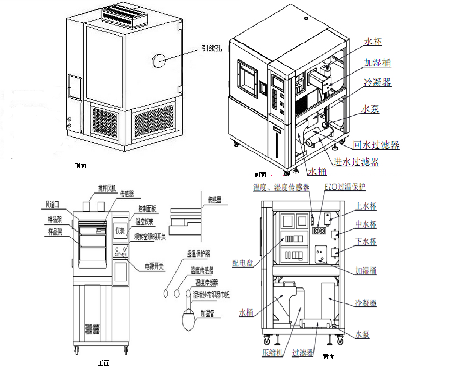 即試驗(yàn)箱體、制冷系統(tǒng)、空氣調(diào)節(jié)系統(tǒng)、電器控制柜、制冷機(jī)組為一整體,制冷機(jī)組位于箱體底部,電器控制部份置于試驗(yàn)箱的側(cè)面,便于操作 |